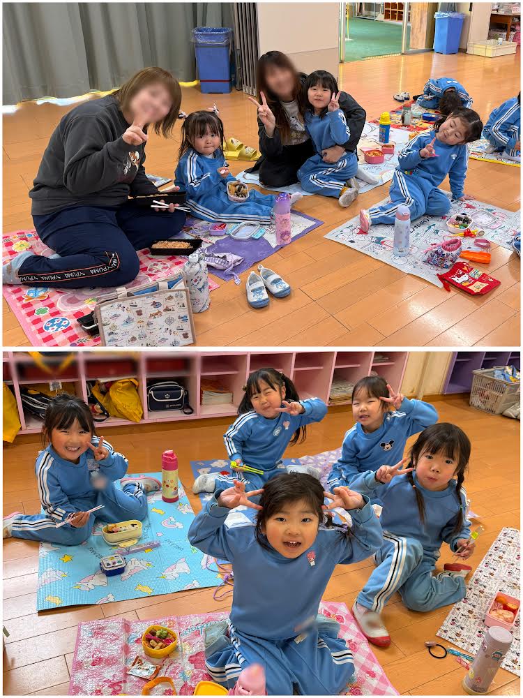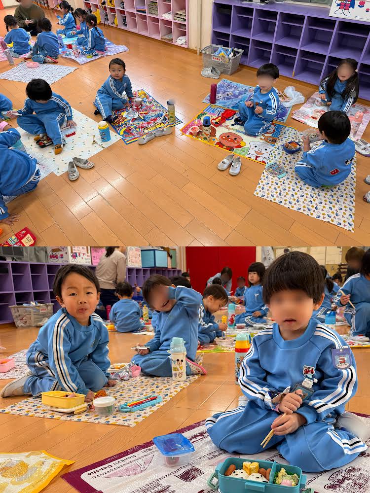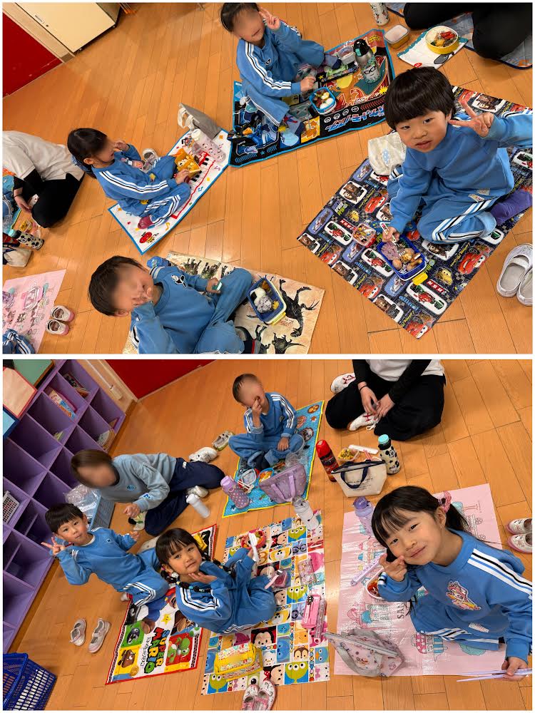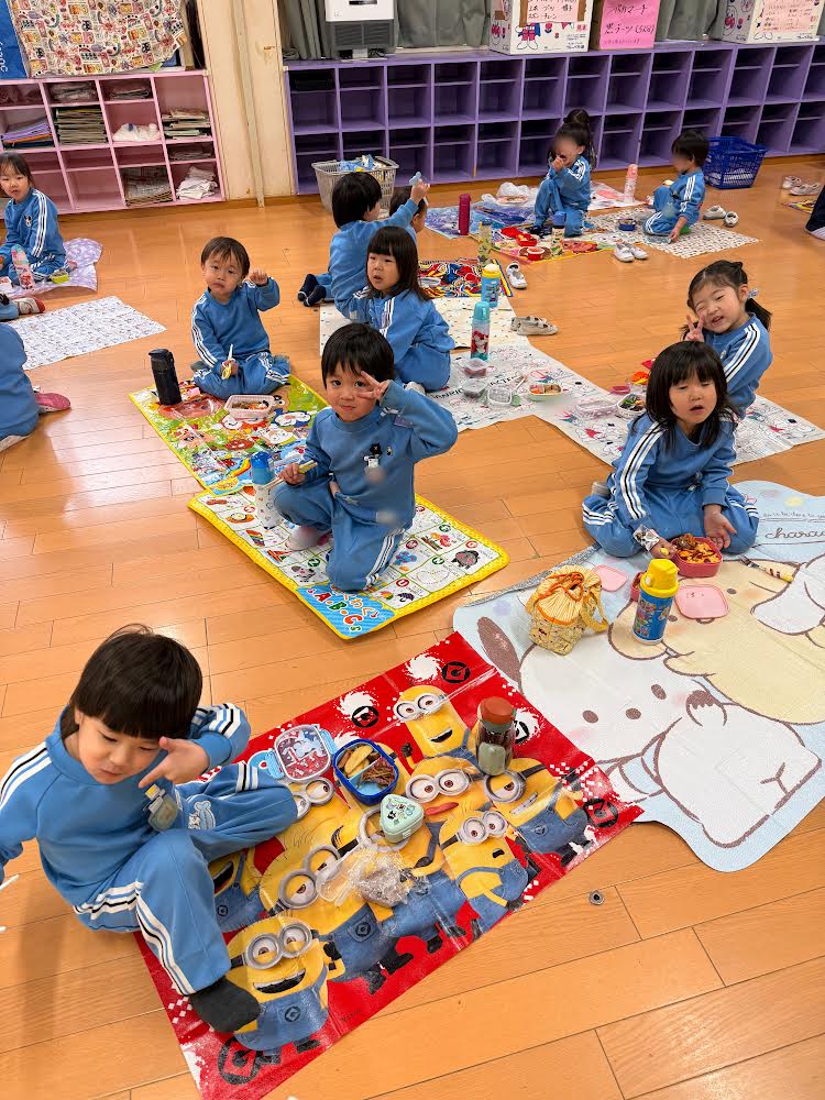 そこで、つくし組さん、年少組さん、年中組さん、みんなでお弁当を食べましたよ🌸