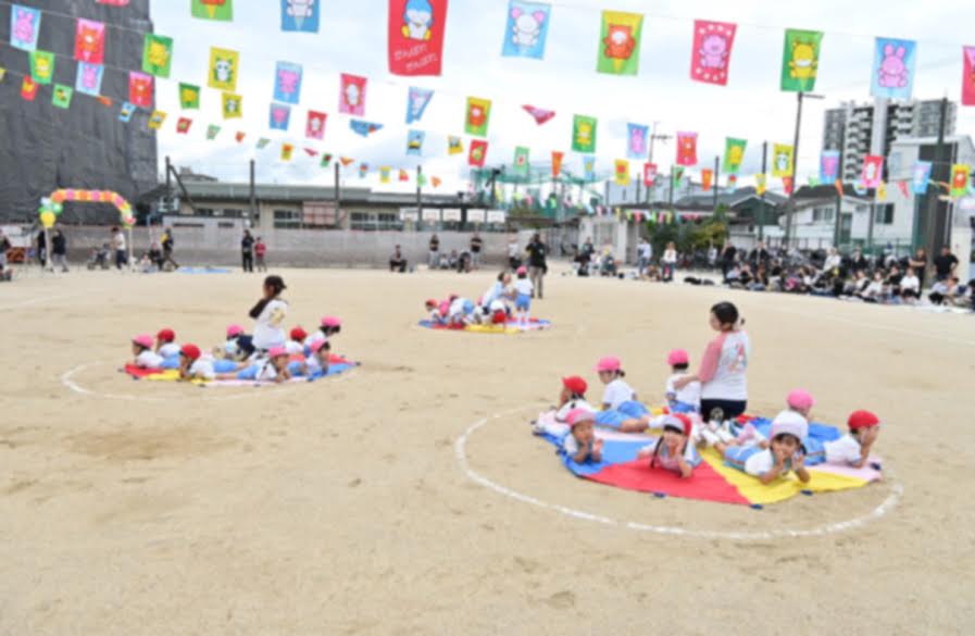 年中・年少組のパラ・バルーンでは手と足にしっかり力を入れてバルーンを引っ張るかっこいい子どもたちの姿が大きな風船や、高く飛んだパラシュートもとっても素敵でした。年長組の組体操では、体操の先生の太鼓の音に合わせて素早く動く年長さんらしい姿に胸が熱くなりました。雨上がりの泥の上でも臆することなく一生懸命逞しい姿を見せてくれましたね。素晴らしいBGMも相まって感動を呼びました。