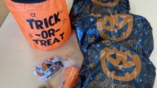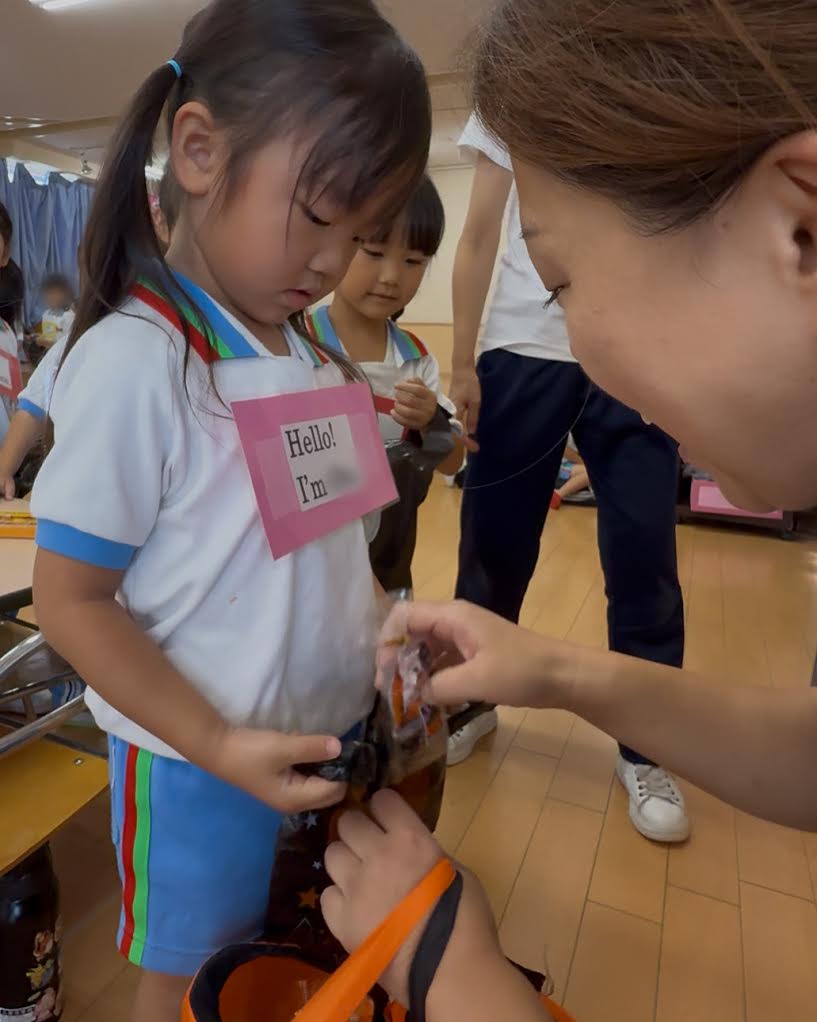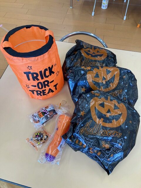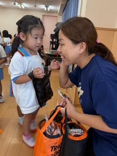 お遊戯室の中で先生たちの元に行き、「トリックオアトリート!」と挨拶するとなんと!!お菓子のプレゼントが🎶