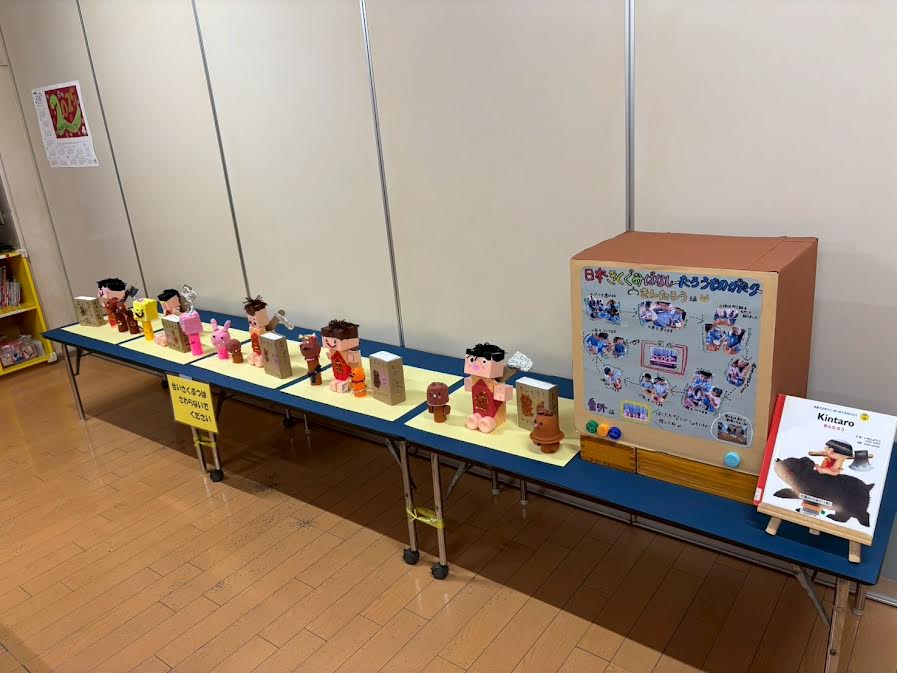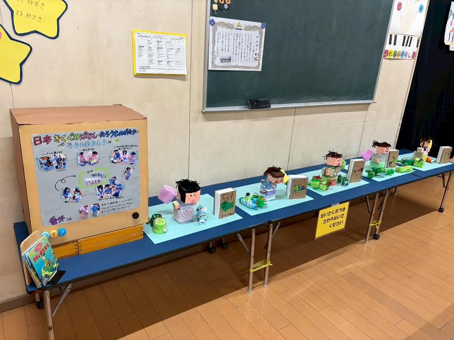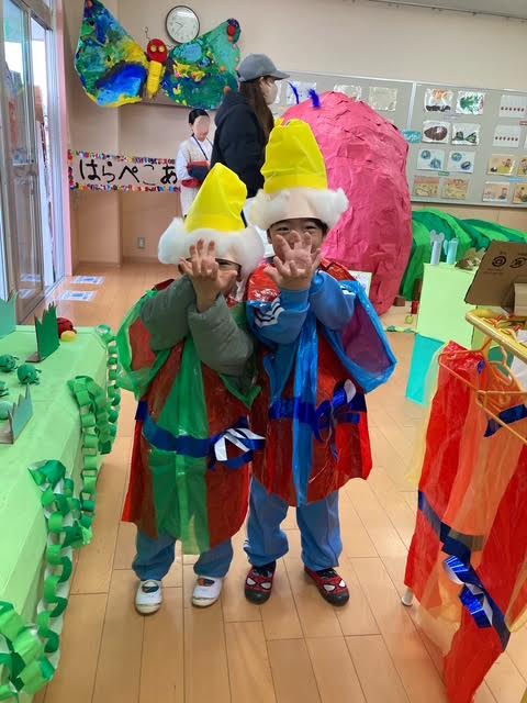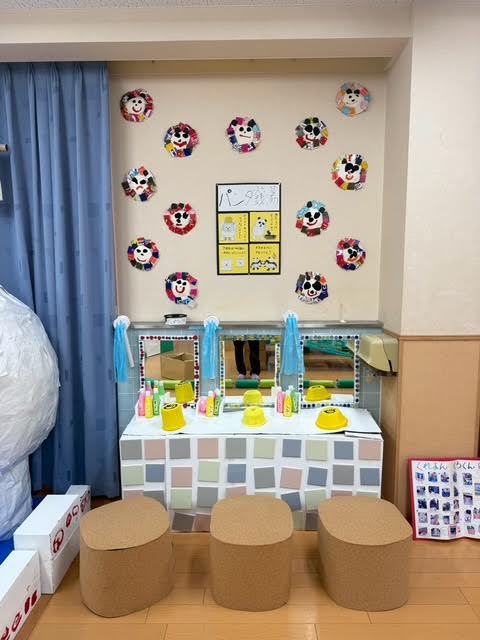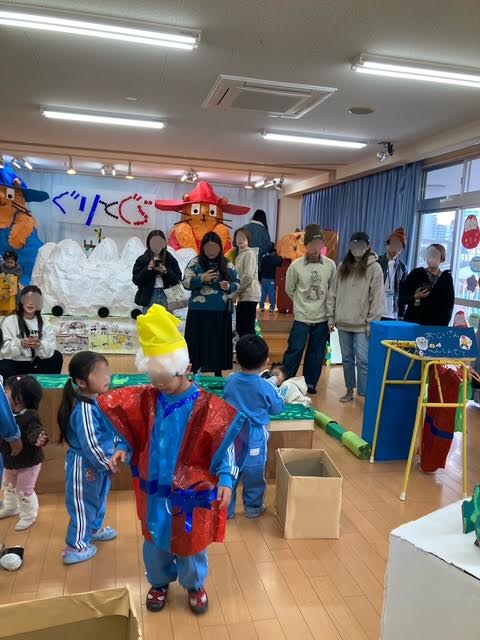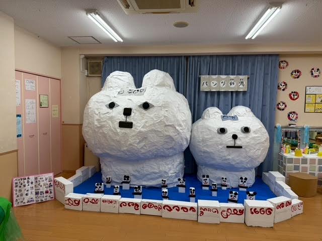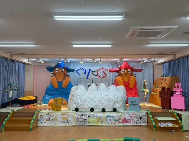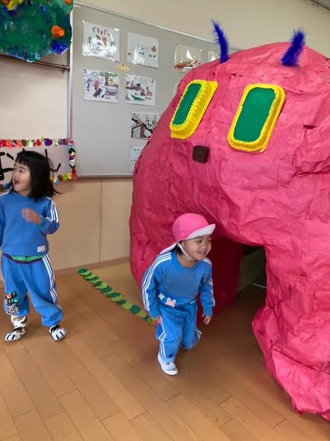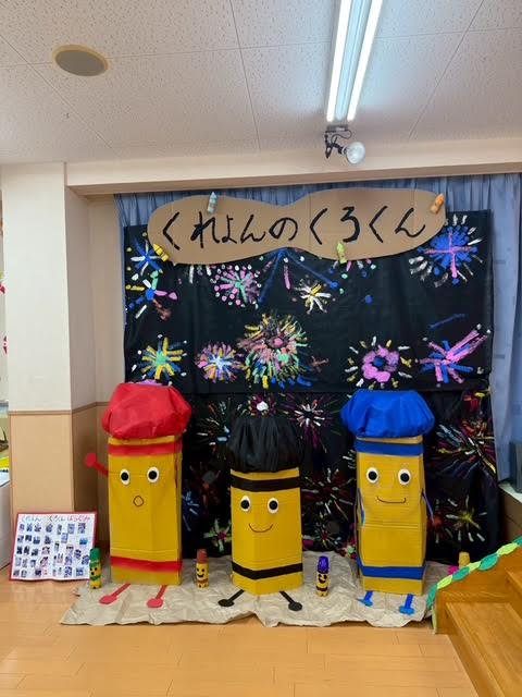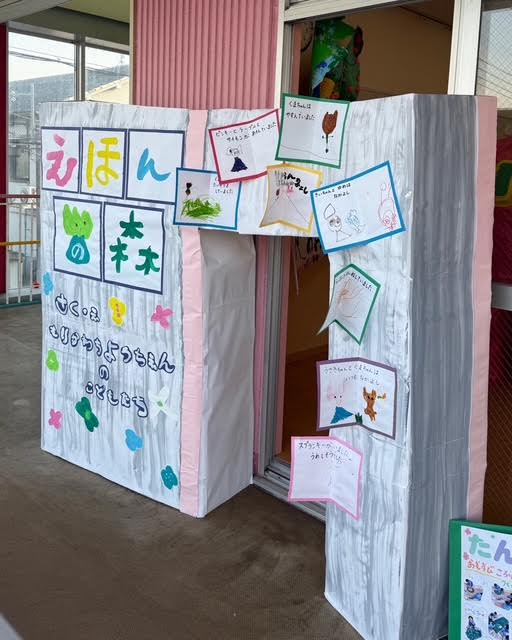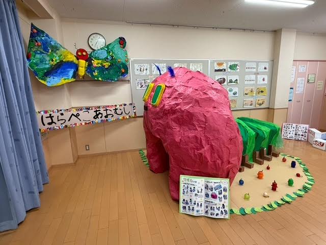 大きな絵本の入り口を潜ると、お遊戯室には年長きく組の『ぐりとぐら』、年中ばら組の『くれよんのくろくん』、年少もも1組の『パンダ銭湯』、満3歳児・2歳児つくし組の『おむすびころりん』未就園児いちご組の『だるまさんが』、全学年で協力して作り上げた『はらぺこあおむし』と『そらまめくん』